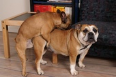 Der französische Bully-Rüde Timmy (stehend) mit der englischen Bully-Dame Tinka. Das "passt" anatomisch gar nicht. Er versucht's trotzdem. :-)